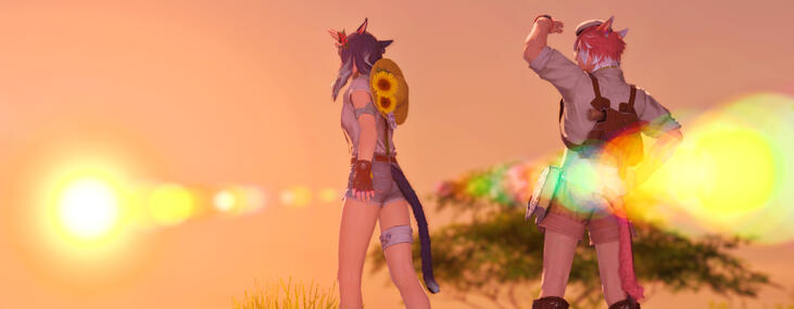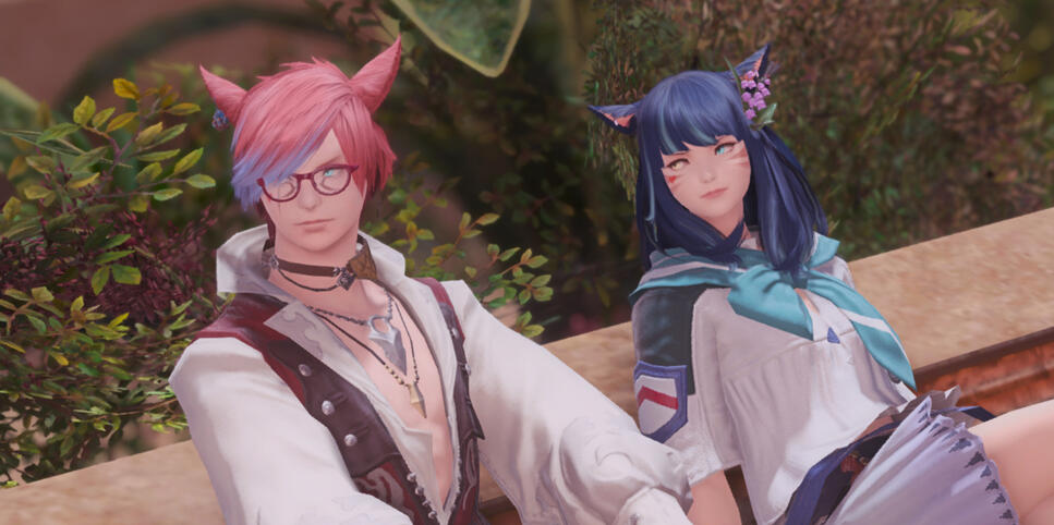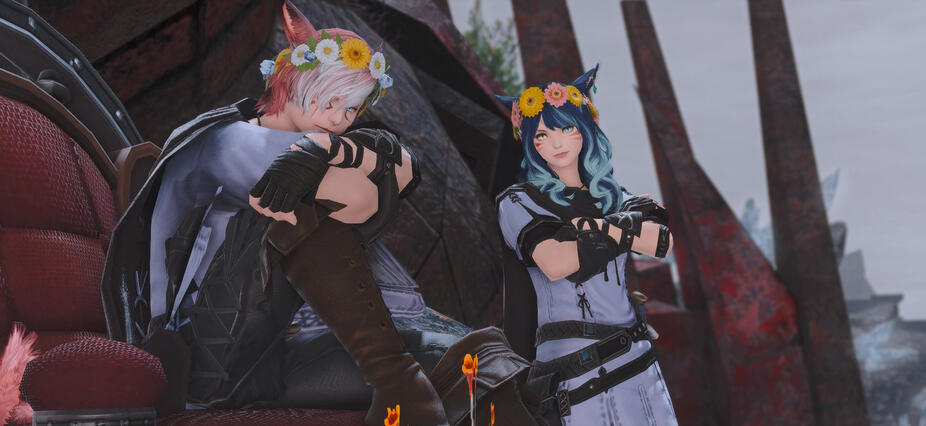 the two decided on sitting down and spending some time alone here. away from rammbroes, from cid and the gang, from socialization. it was sorely needed for the both of them.her head rested against his shoulder, her eyes lazily watch as his fingers drew patterns on her palm. the bouquet is nested on her thighs, still within the clutches of her right hand. the relaxing vibe of this moment was something she'd give up anything for."i've always wanted to ask…" g'raha eventually breaks the silence. "why do you like this spot?" there are many answers, many ways she could reply. but ultimately, it came down to one thing."the view."g'raha looks up at her answer, following her gaze which was directed at the crystal tower. "the view?"she nods. "y'know how much i love to explore. when we were young, koo would always complain when i dragged him to explore the hills around our village," a smile forms on her lips as memories are recalled. "but in the end, he'd always comply, purely for the view at the end. he'd be in awe, entranced even, and say it was worth it, even if he'd grumble on the way back."a sigh escapes her lips. oh brother, where are you? where have you gone?"and you would force him to climb up here, show him this place?" g'raha replies."i think he'd love this view. he'd always love... seeing structures from mountaintops…"he wraps an arm around her shoulders in assurance. there wasn't much he could say, and she understood that. still, his presence was comforting enough. she finally breaks her gaze away from that view and nuzzles her face into his neck, feeling some of the stress lift. they stay in that position for a good while."let's get back to the revenant's toll, before the others get worried." he stands up, offering a hand to her. she takes it and doesn't let go.